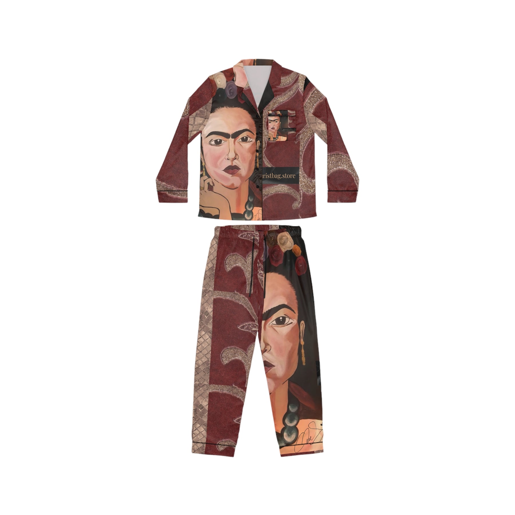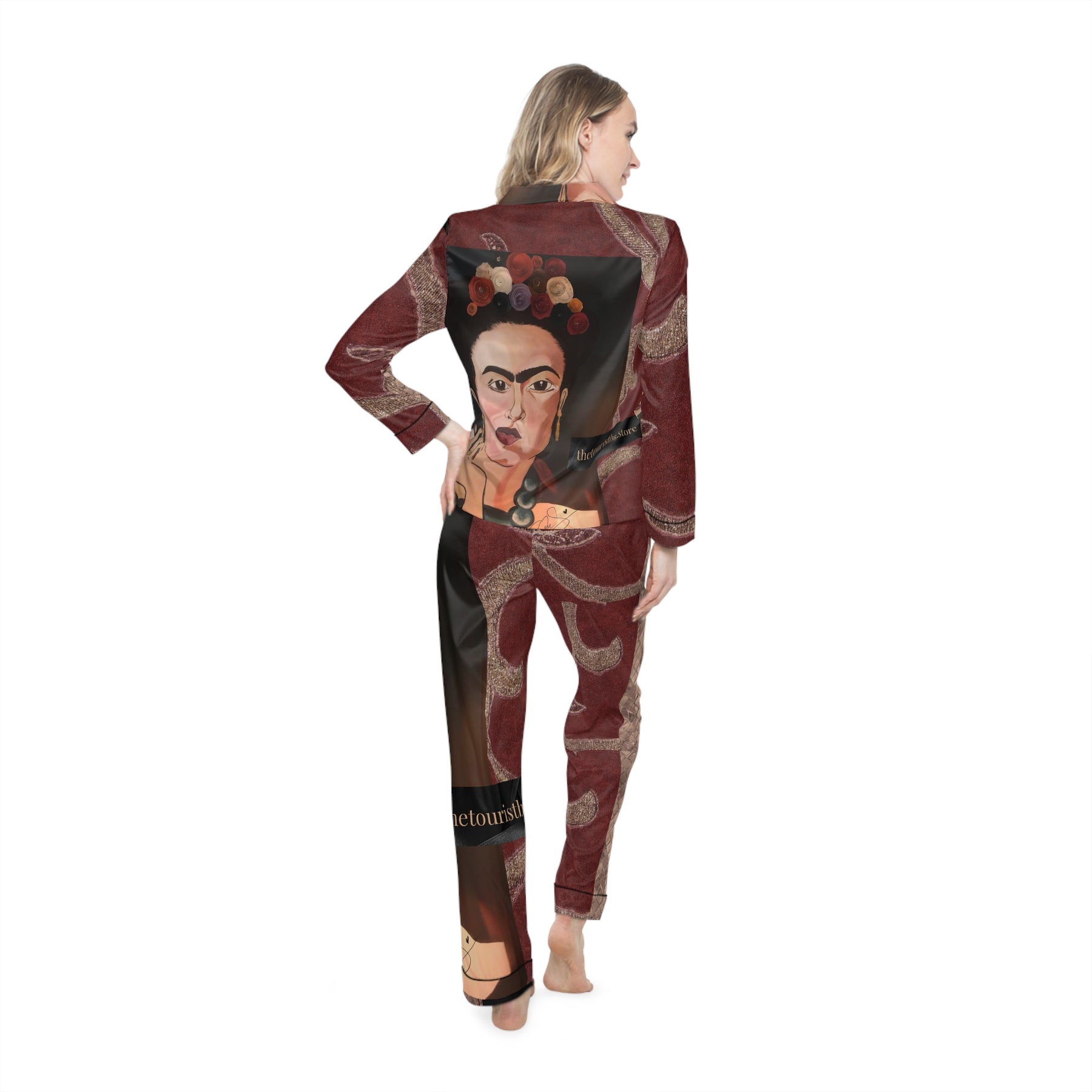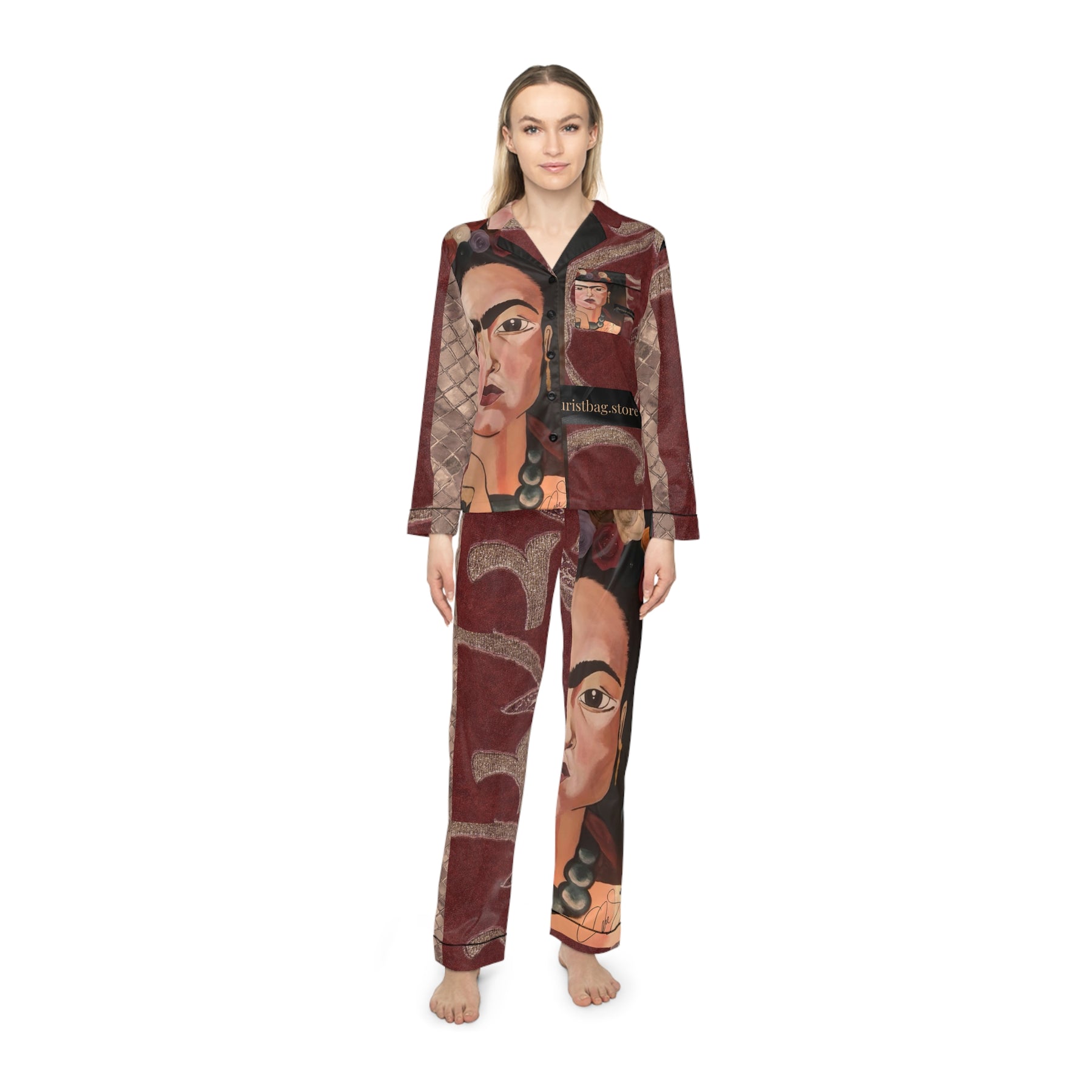 Frida by Aura – Vintage Ember Women’s Satin Pajama Set is part of our Frida by Aura Guest Artist Collection — a tribute to Frida’s bold self-expression, vibrant color, and emotional storytelling through art. Each piece features the Vintage Ember Women’s Satin Pajama Set artwork, blending art and everyday life.