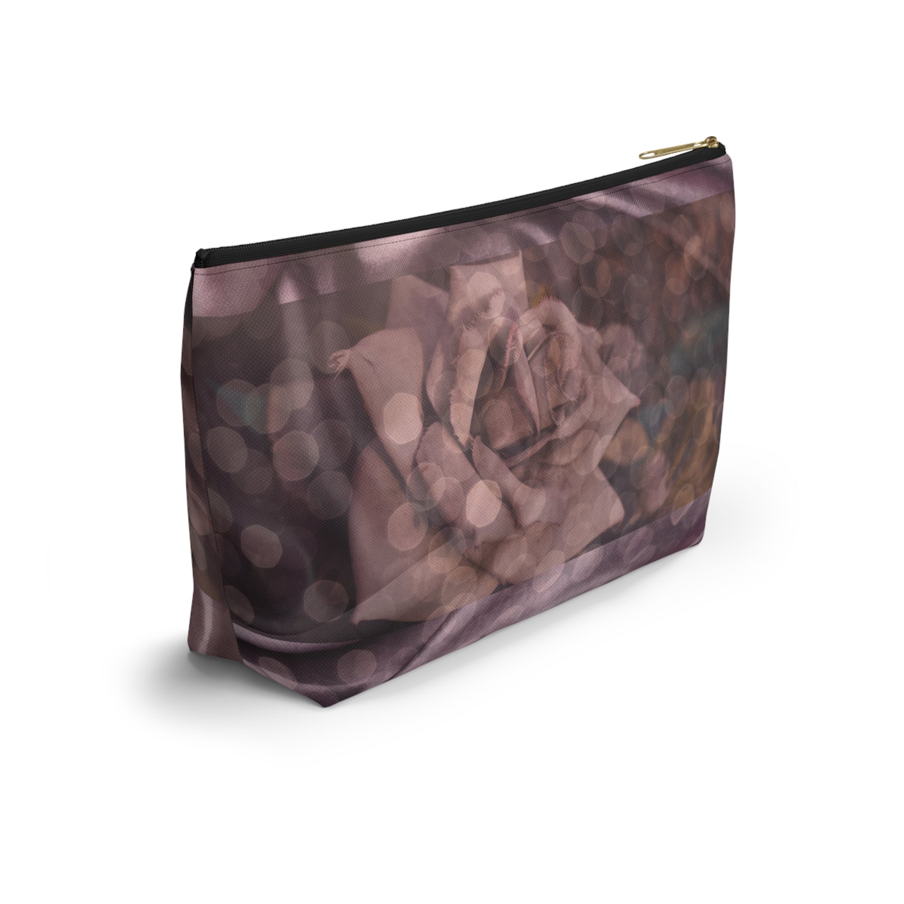Celebrate love with our Dust & Roses Accessory Pouch w/ T-bottom, perfect for weddings, honeymoons, or romantic keepsakes. Crafted with care, featuring 100% spun polyester, non-woven black laminate interior, multiple sizes, durable zipper closure. Designed as a beautiful, functional reminder of every special moment.  They make excellent cosmetic travel bags. They are constructed from a durable material with a zipper closure.