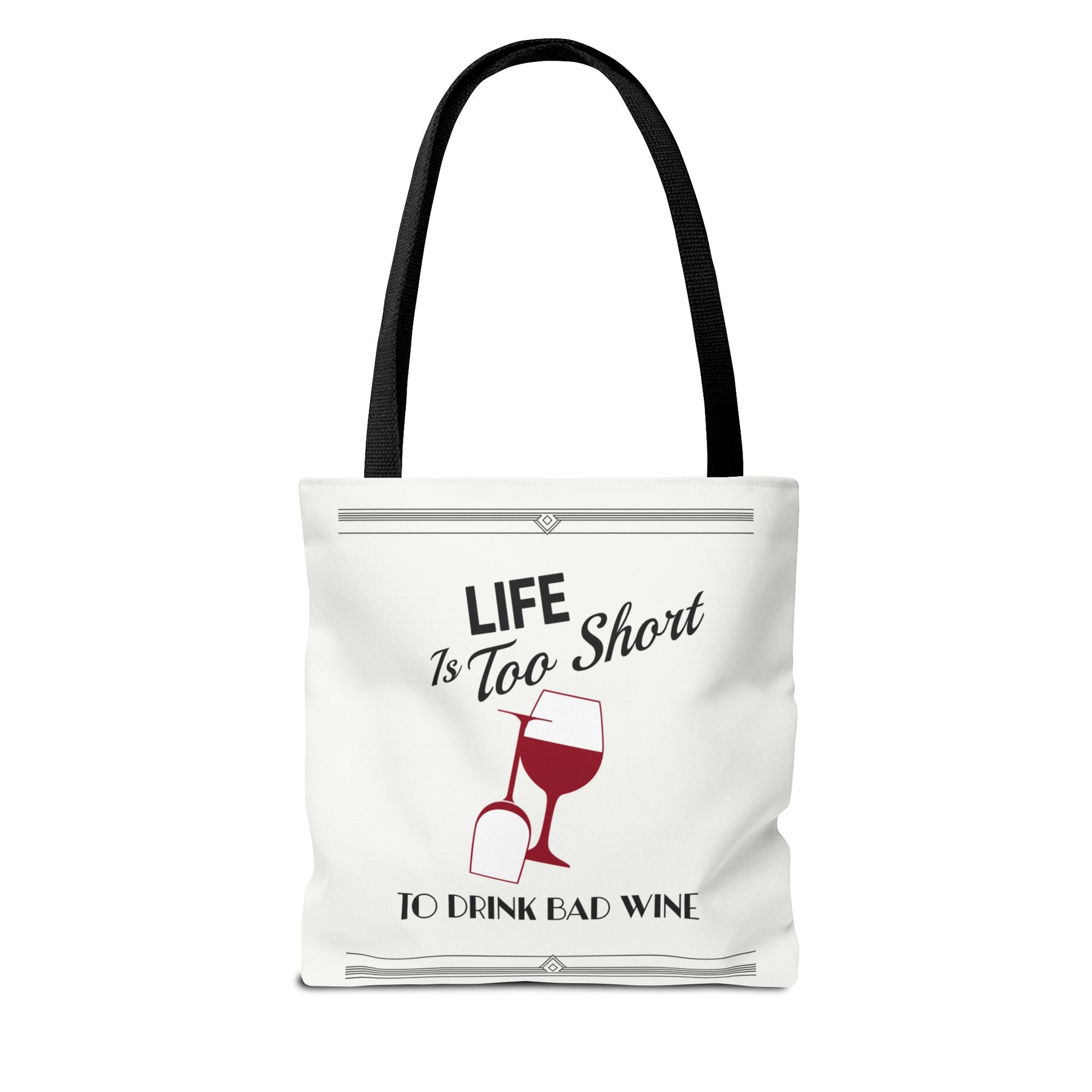 Our Life is Too Short to Drink Bad Wine, tote bag is perfect for picnics and wine days.  Made with spun polyester, these bags feature double-stitched seams, cotton webbing straps, and nonwoven laminate lining for high-end durability.