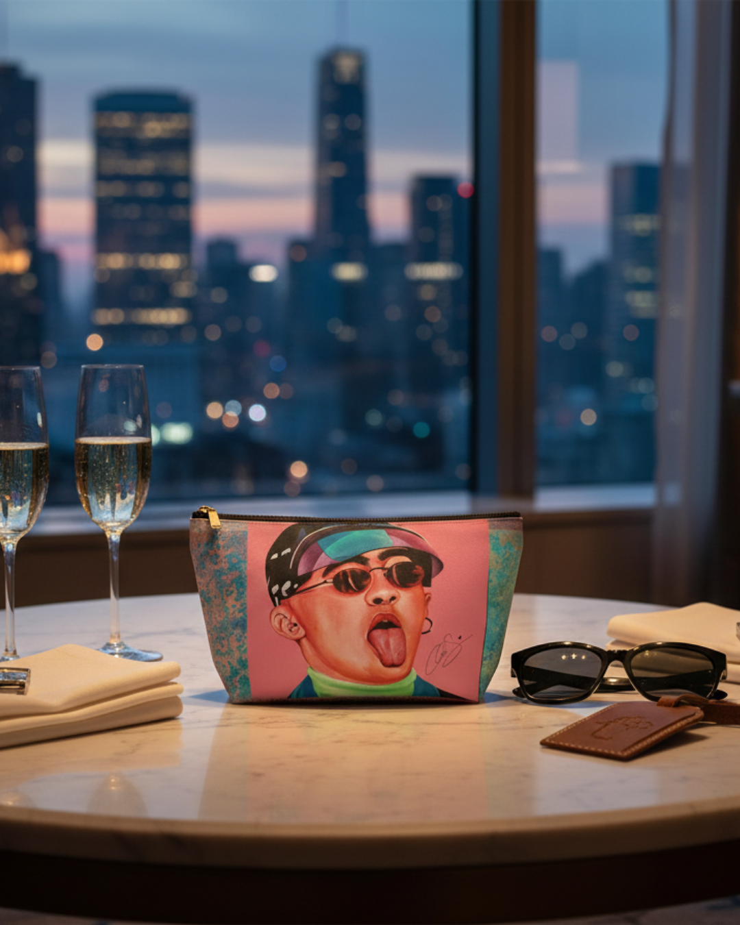 A rosy-meets-chrome palette with metallic texture—equal parts bold and polished. A sturdy T-bottom pouch for cords, cosmetics, and small travel treasures. Part of The Tourist Bag Guest Artist Collection (Inspired by Bad*Bunny) designed by Aura.