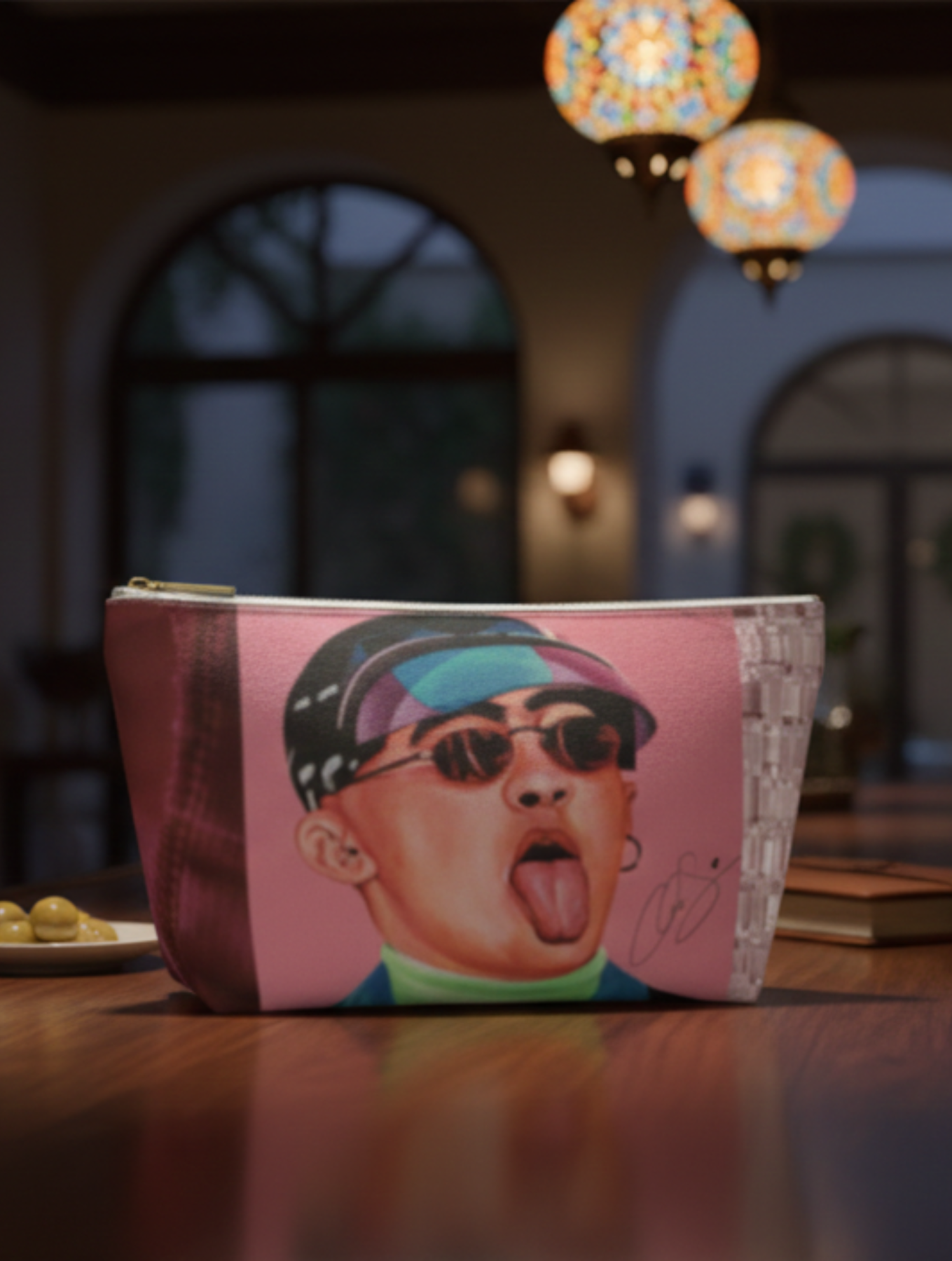 Faceted pinks, subtle lace, and gem-like accents bring luxe sparkle to every getaway. A sturdy T-bottom pouch for cords, cosmetics, and small travel treasures. Part of The Tourist Bag Guest Artist Collection (Inspired by Bad*Bunny) designed by Aura.